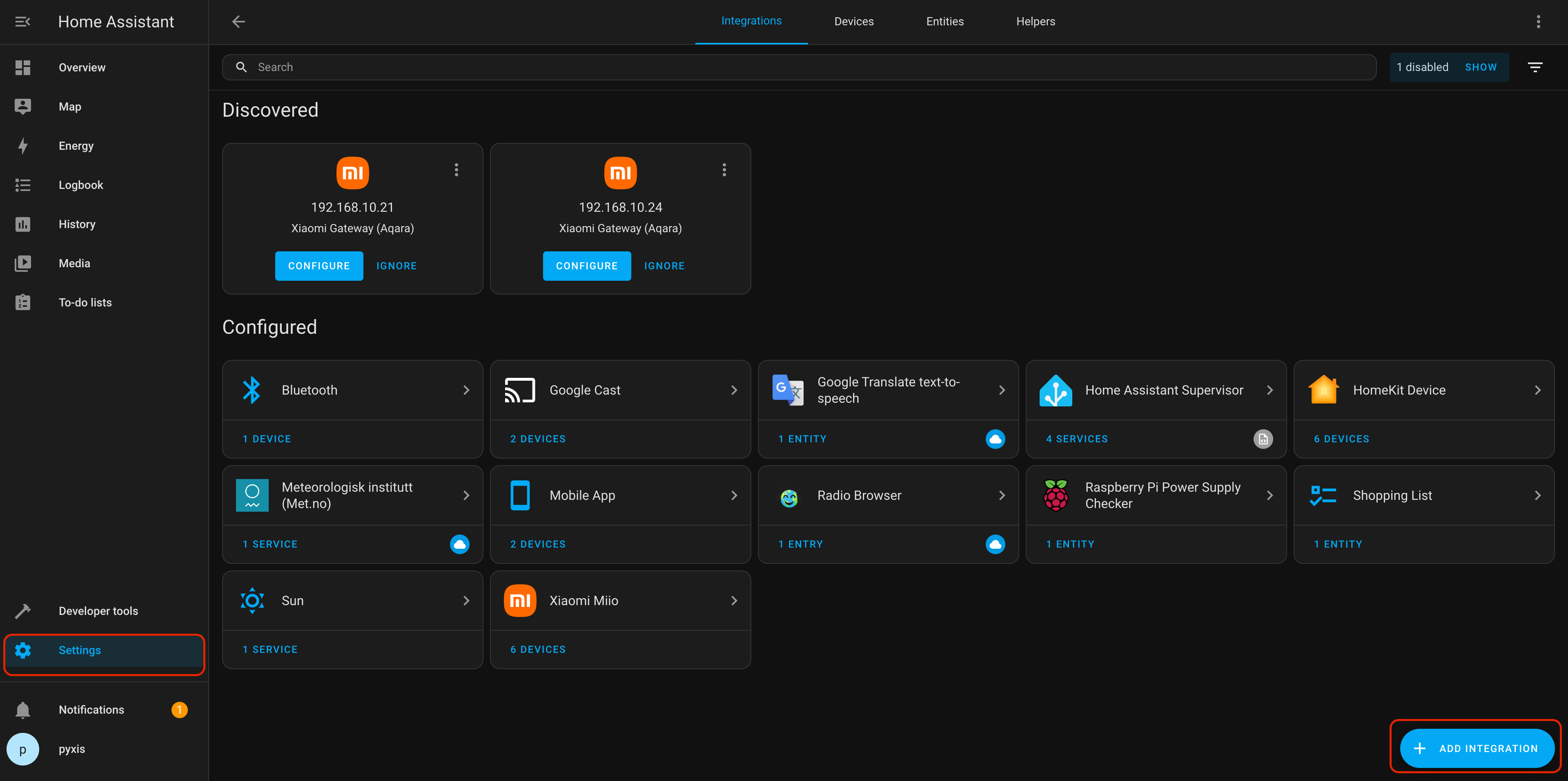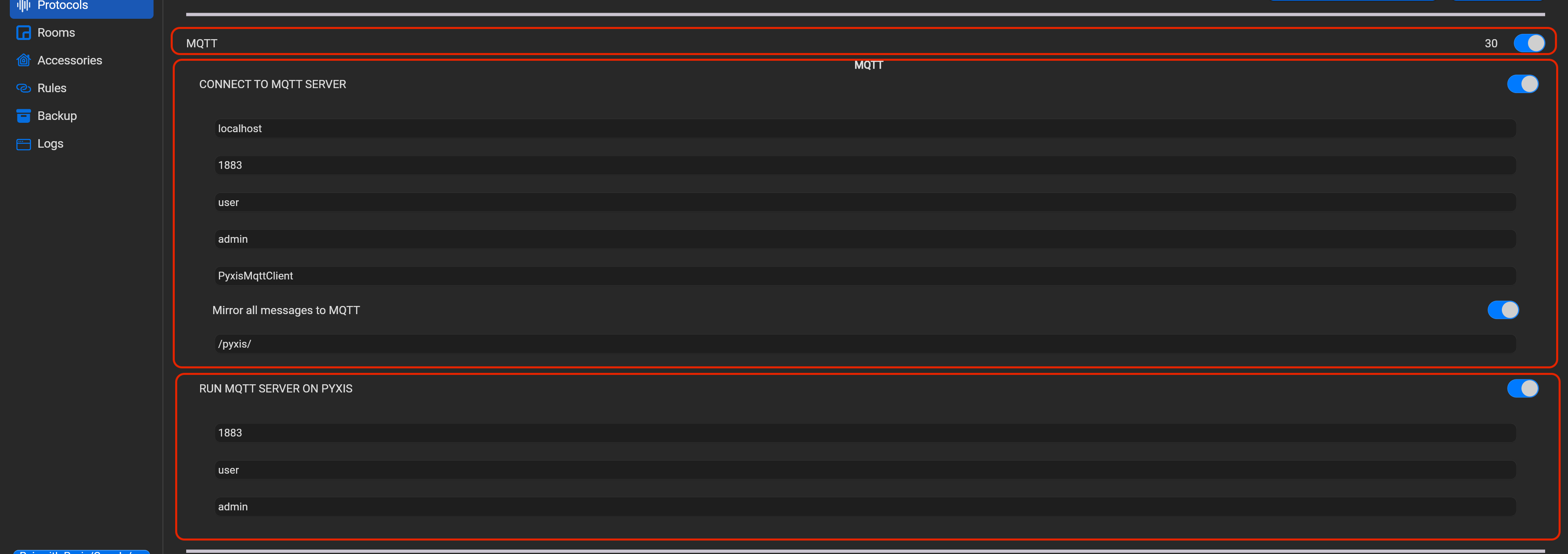 in settings of Home Assistant, add MQTT integration and input settings of MQTT server on Pyxis (Settings ==> Devices&services ==> + Add integration ==> MQTT).